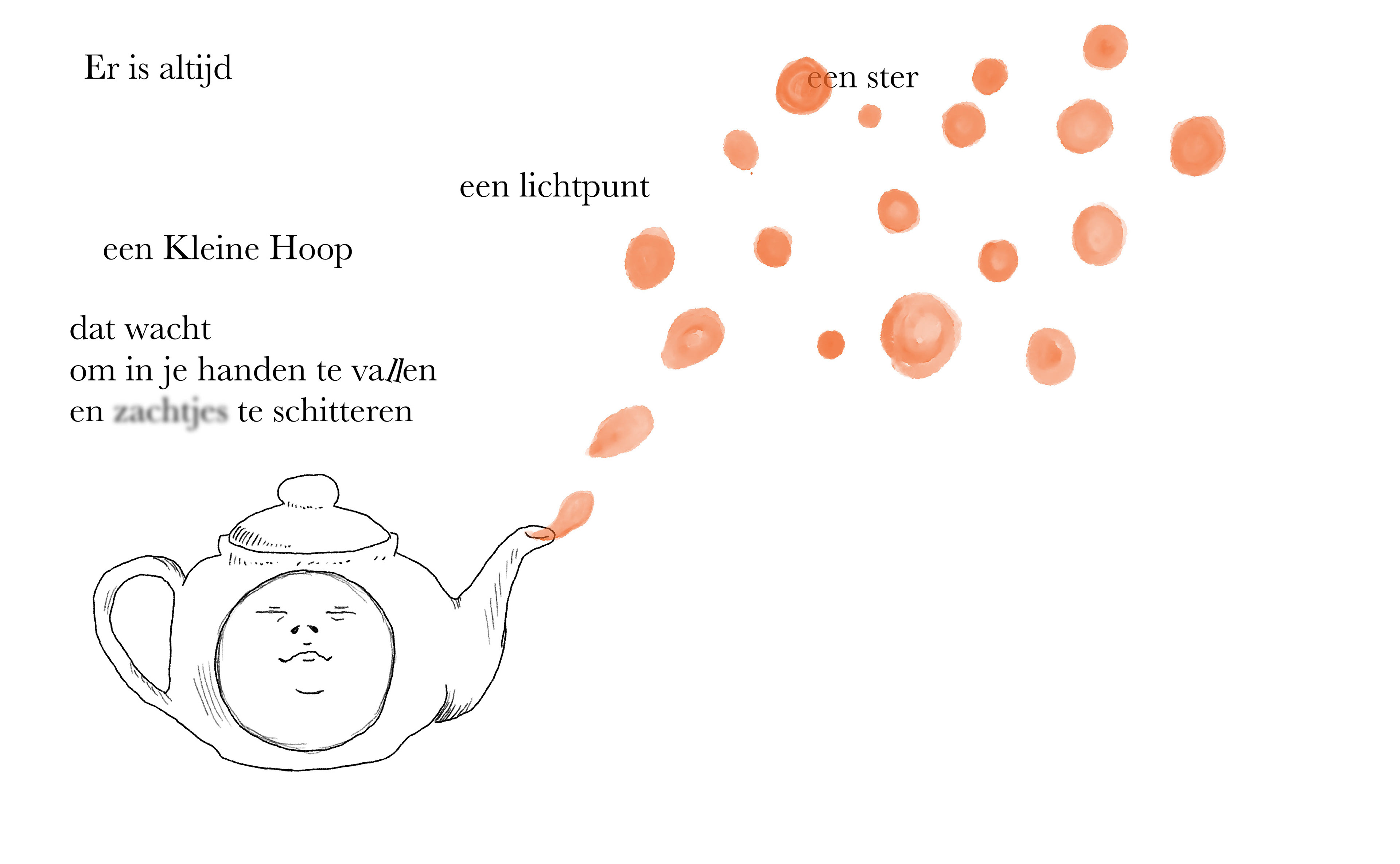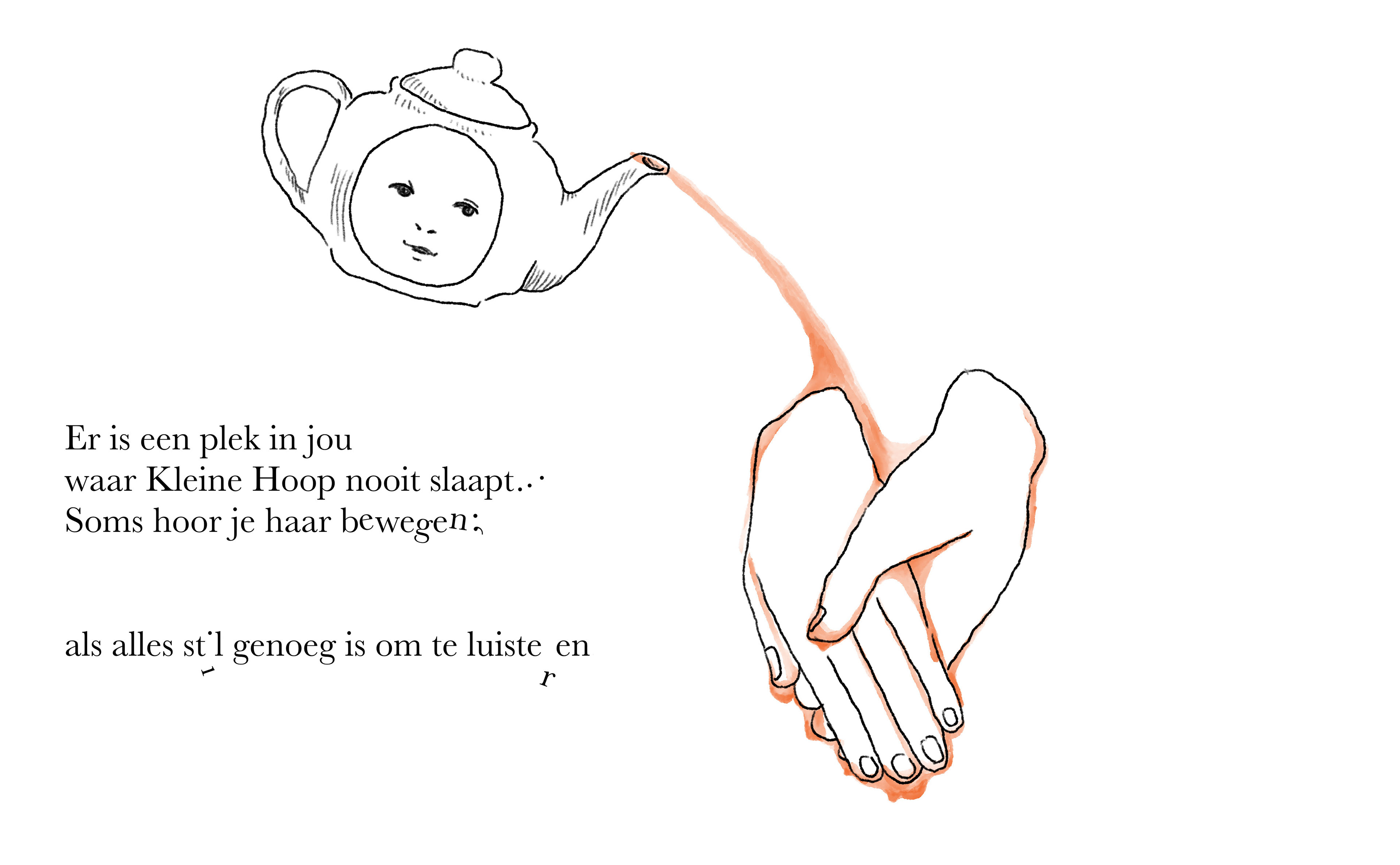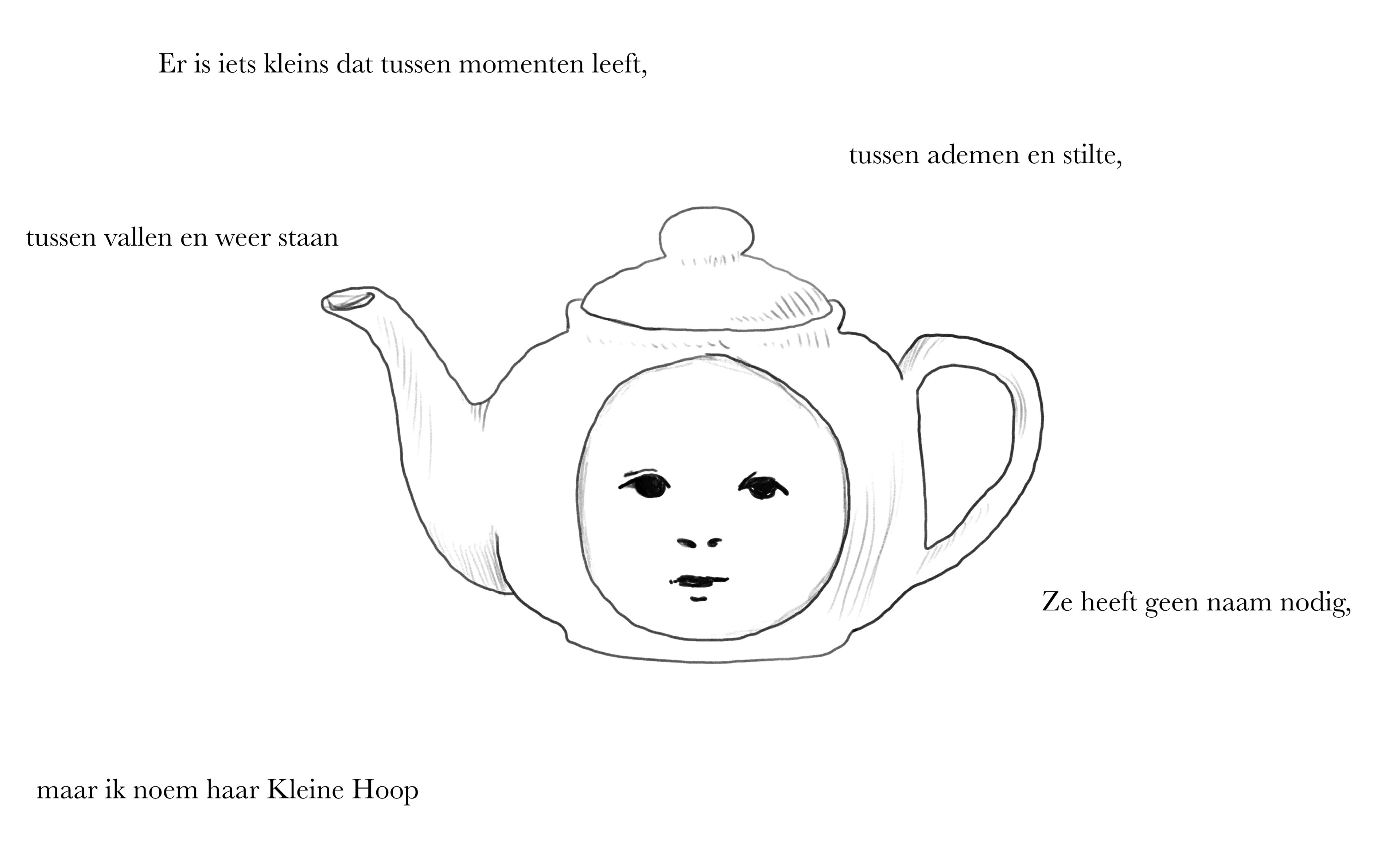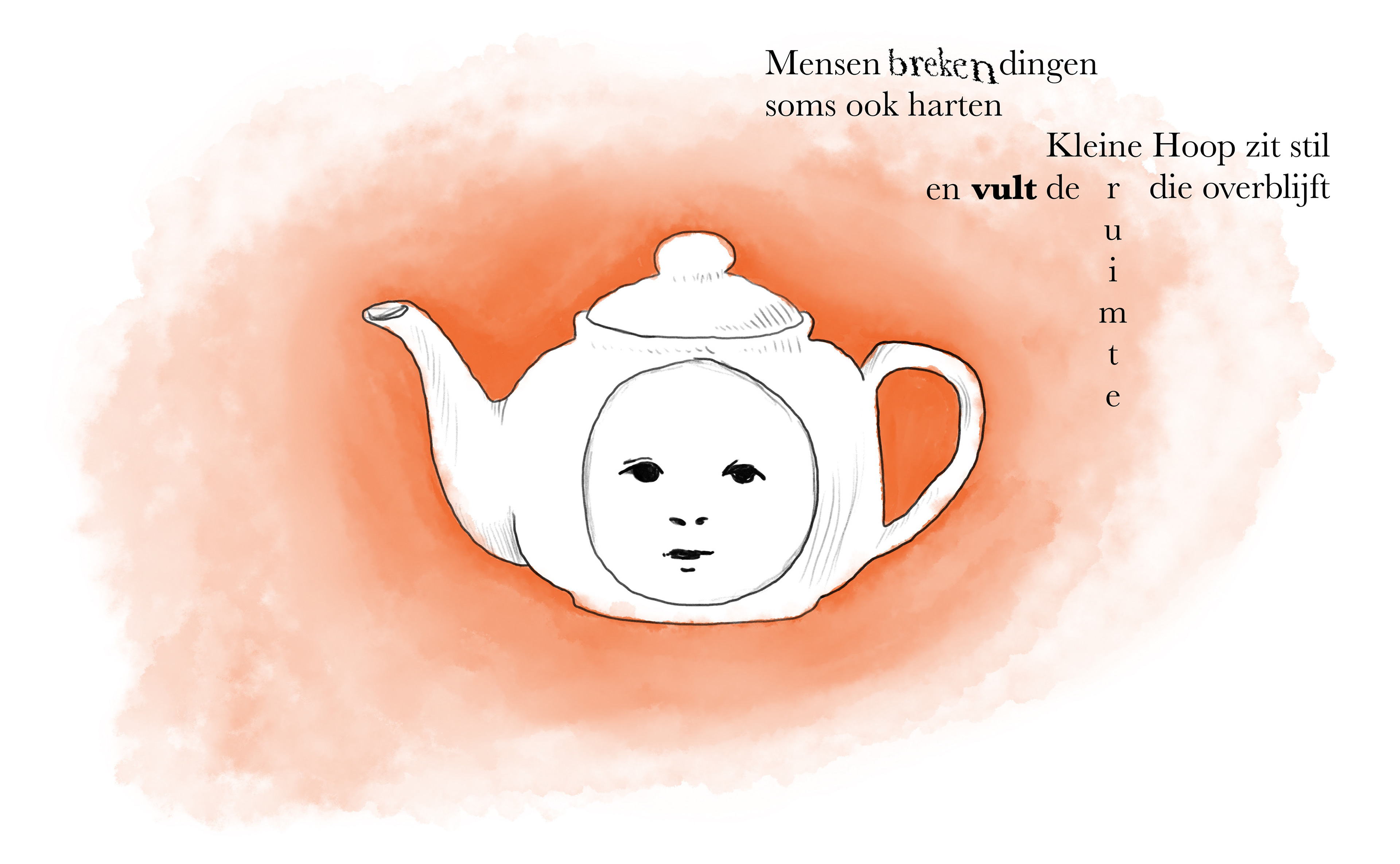 Ik schreef een gedicht over hoop en vertaalde het vervolgens in illustraties. Hoop wordt in het boekje een personage: een kleine theekan met een rond, zacht gezichtje. Voor mij staat een warme kop thee voor troost, zachtheid en precies dat beetje warmte dat je nodig hebt wanneer alles te veel voelt.