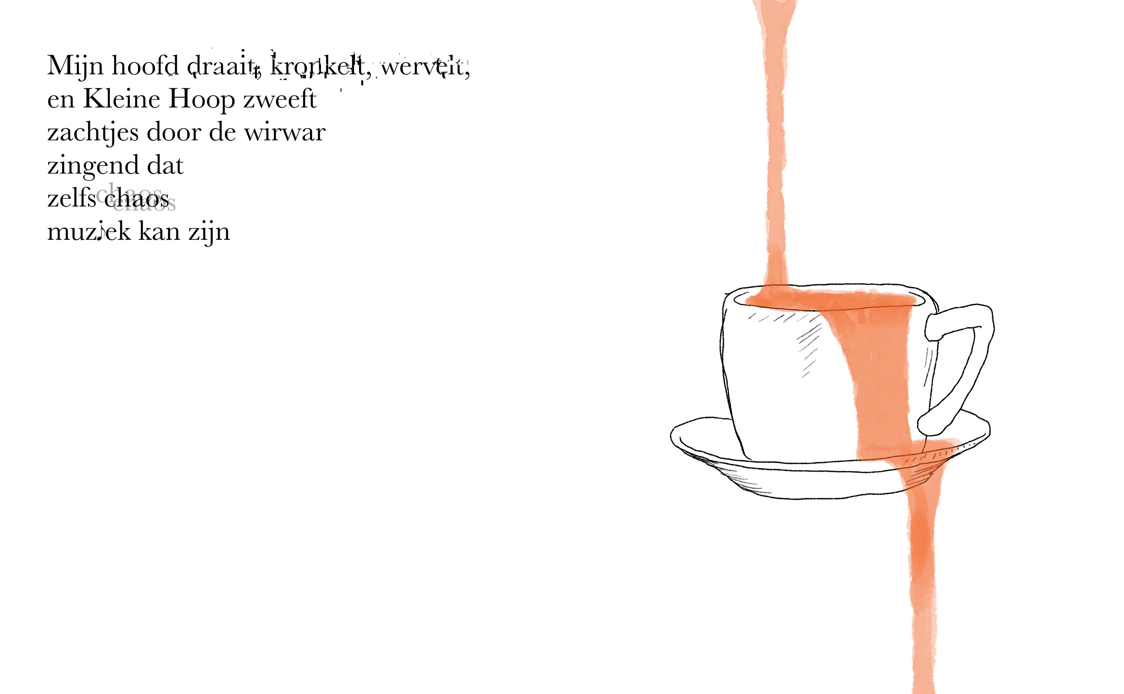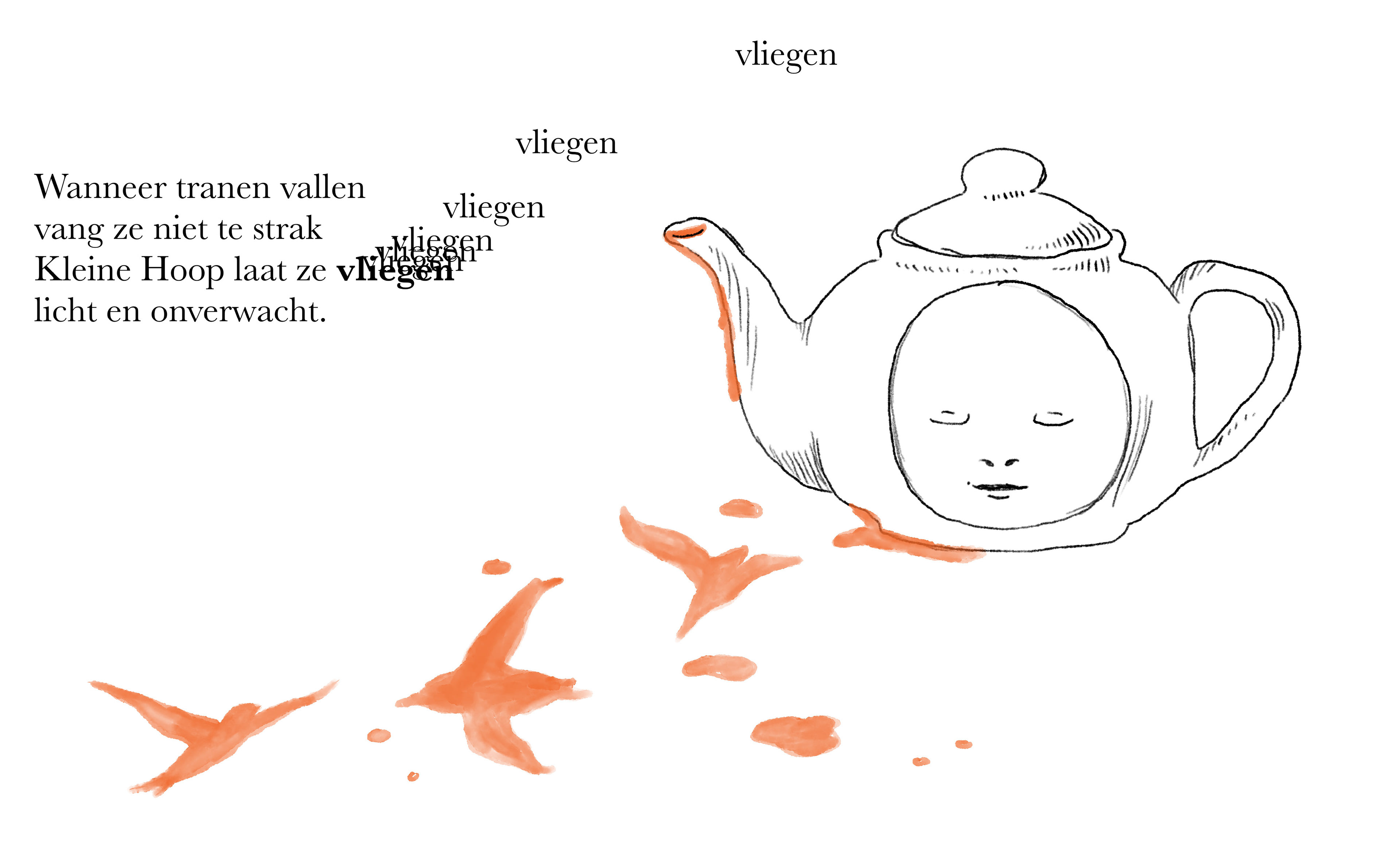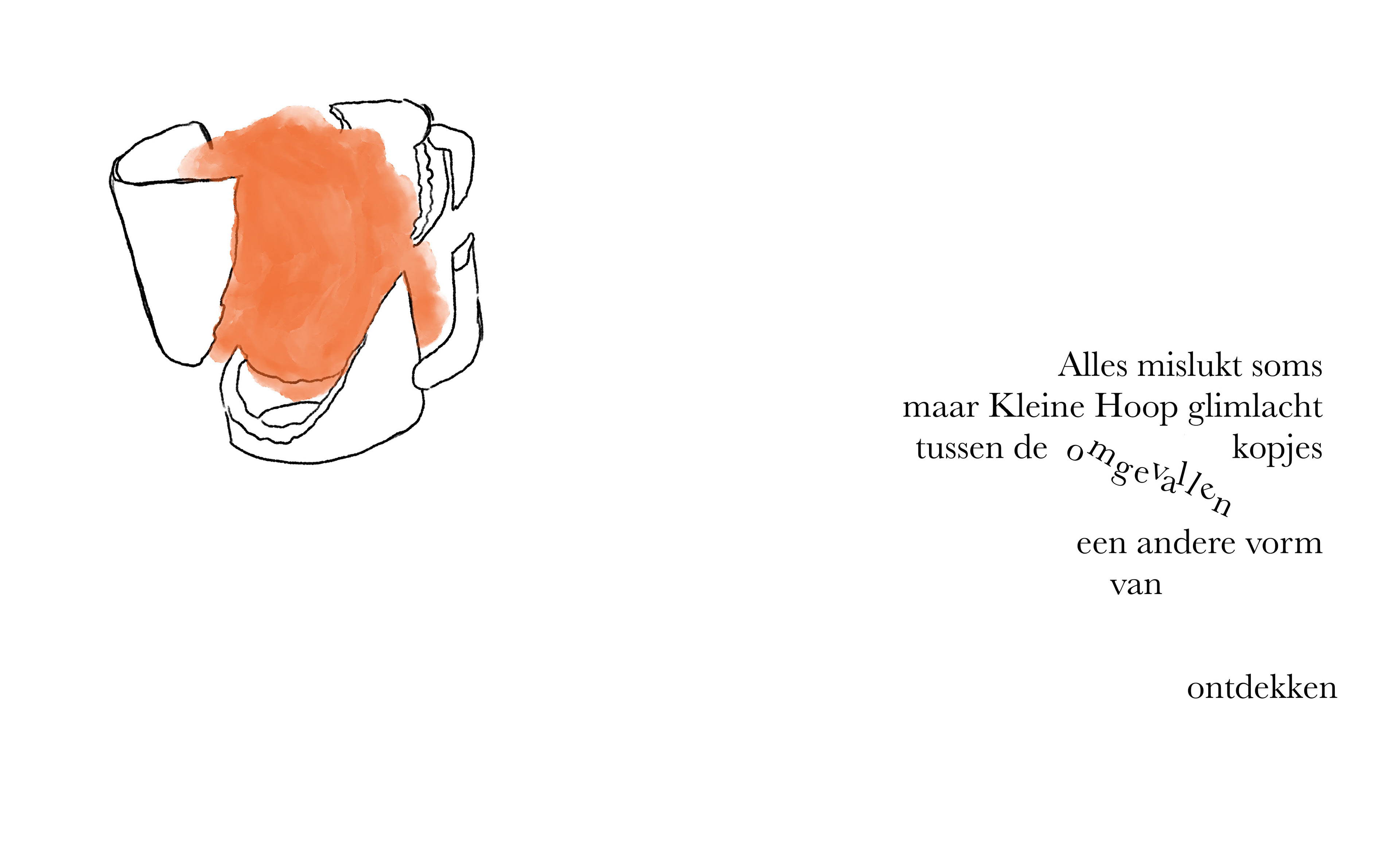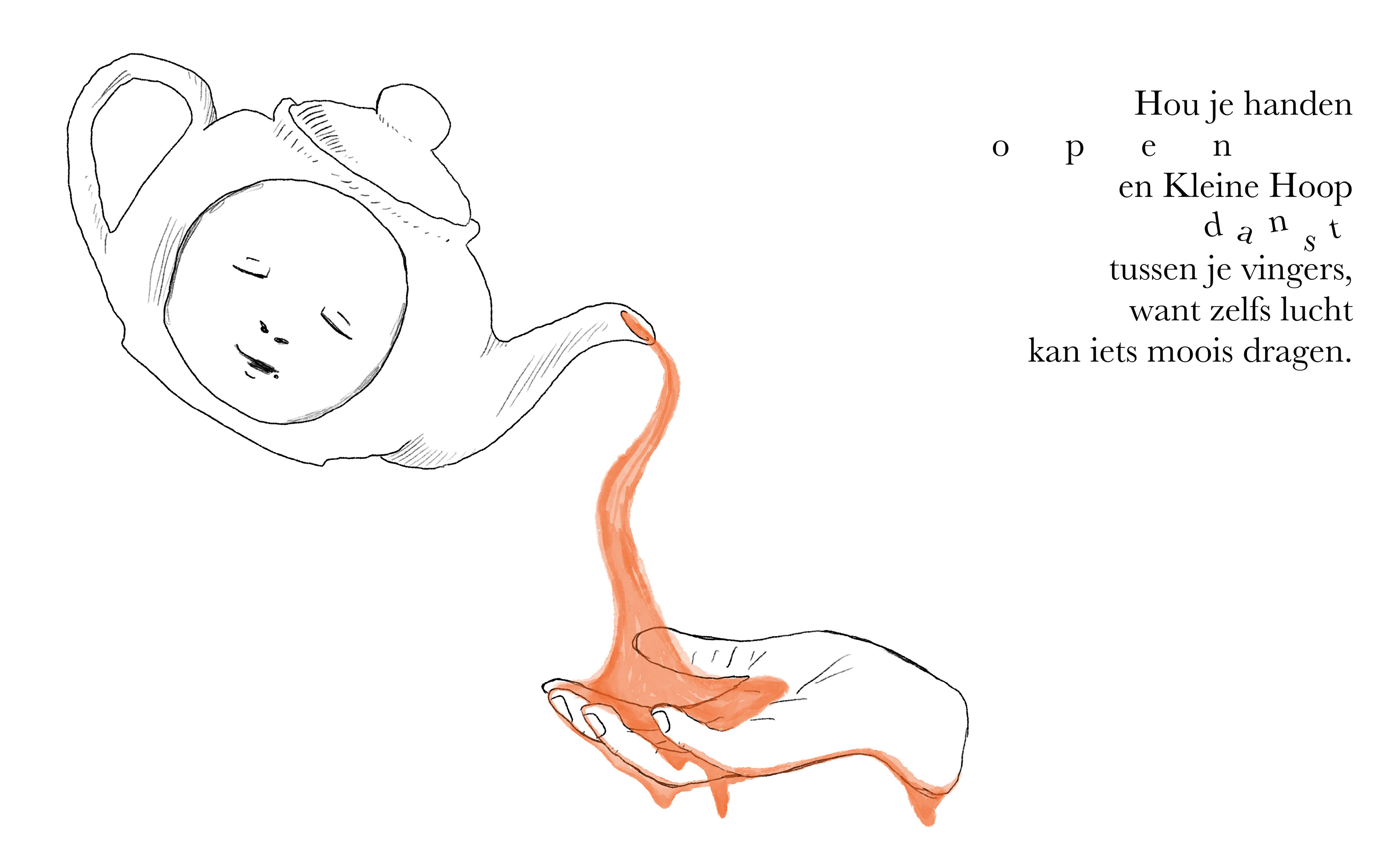 Ik schreef een gedicht over hoop en vertaalde het vervolgens in illustraties. Hoop wordt in het boekje een personage: een kleine theekan met een rond, zacht gezichtje. Voor mij staat een warme kop thee voor troost, zachtheid en precies dat beetje warmte dat je nodig hebt wanneer alles te veel voelt.