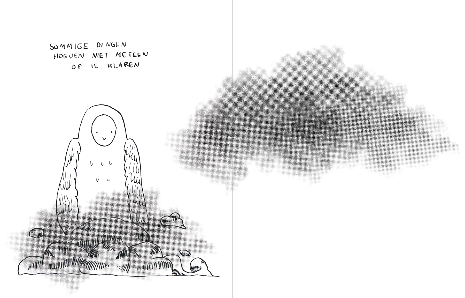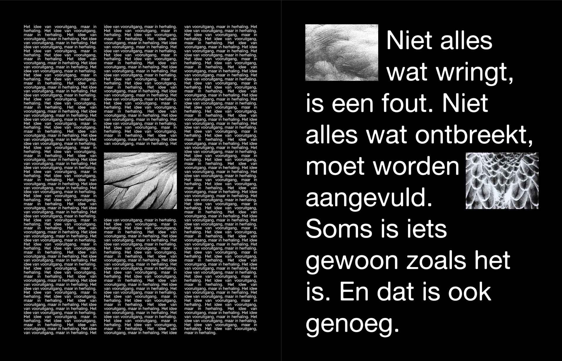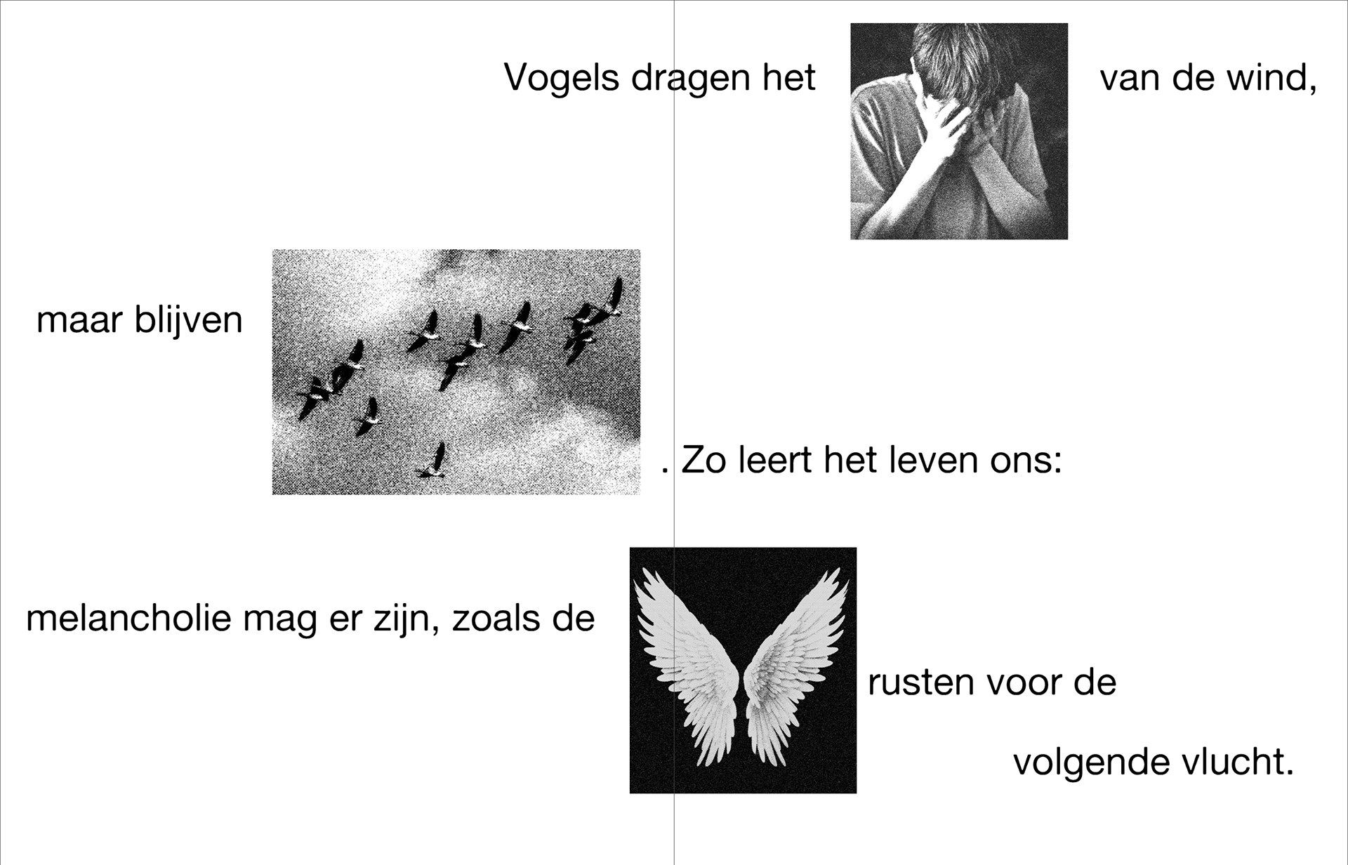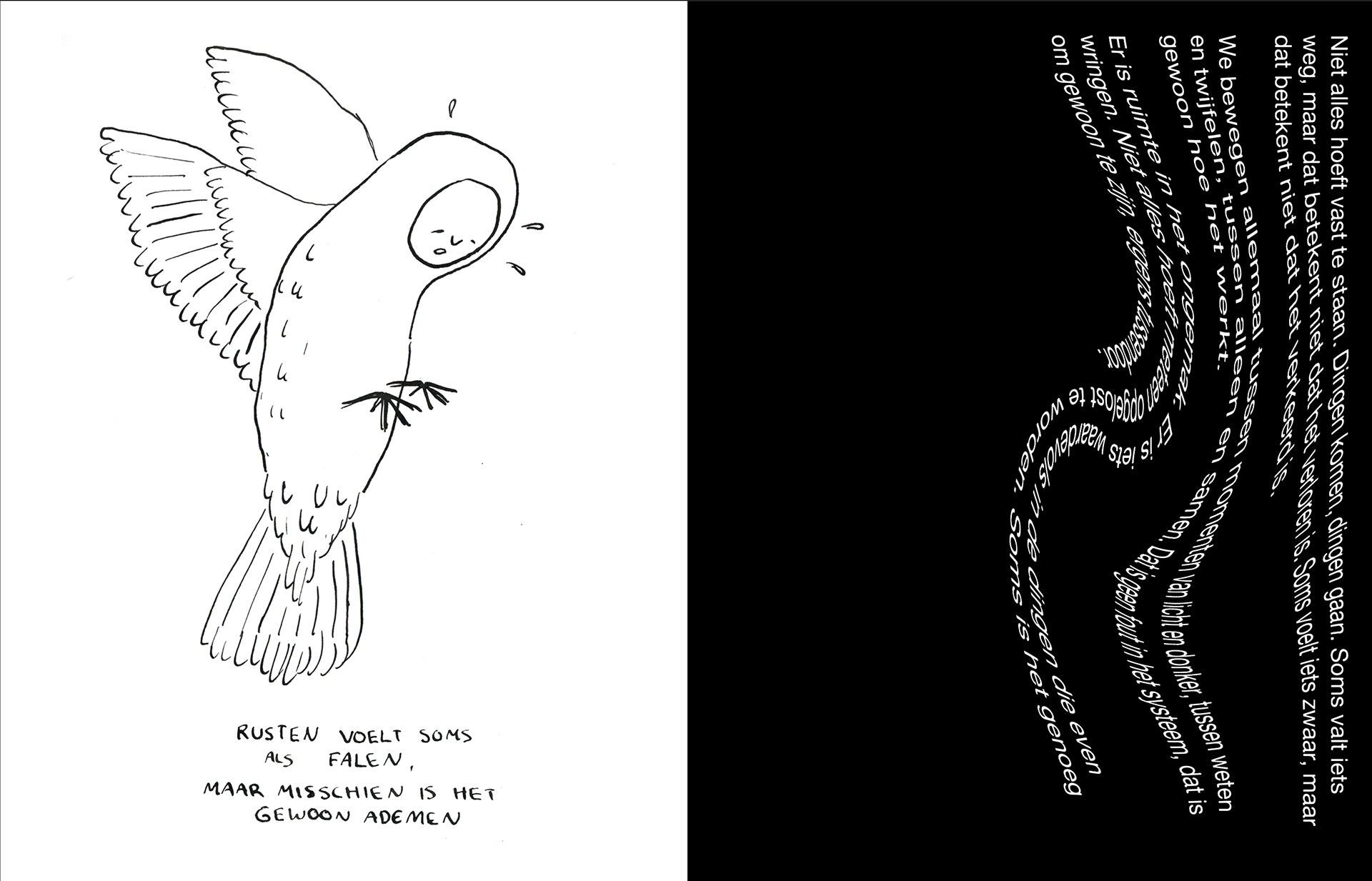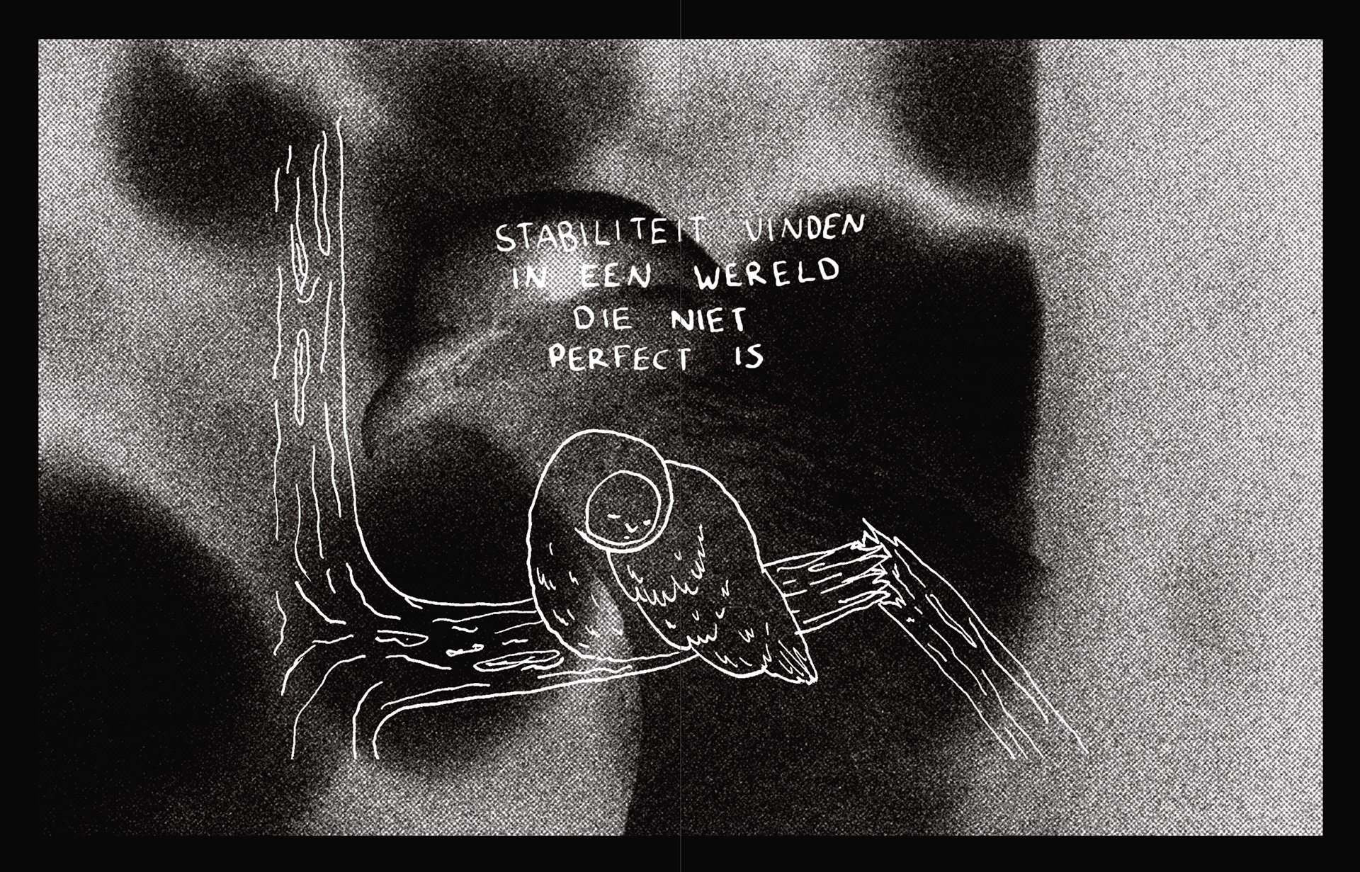 In “TUSSENIN - over het balanceren tussen geluk en ongeluk, tussen vallen en vliegen” onderzocht ik hoe we leven in een wereld die geluk als standaard ziet, terwijl ongeluk vaak wordt weggeduwd, terwijl juist dát ons menselijk maakt. Thema’s als melancholie, kwetsbaarheid, de schoonheid van het gewone en het ongemak van verdriet komen terug in dit werk.